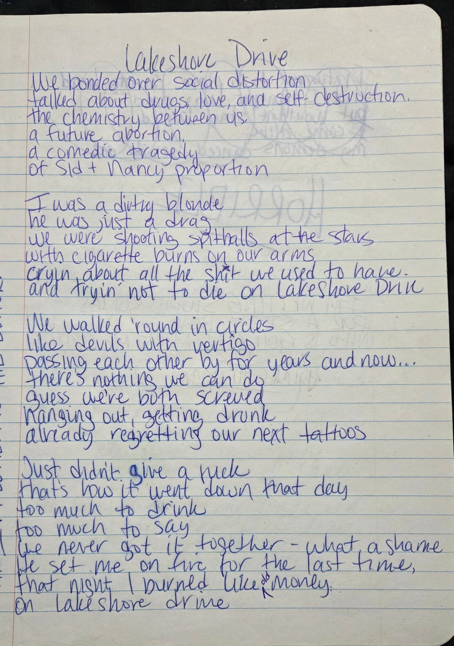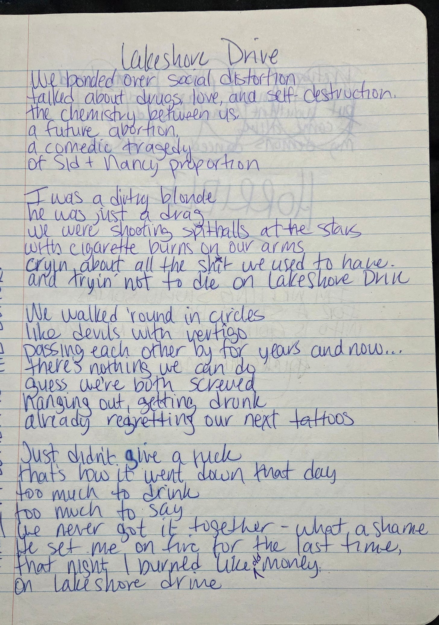 When I read it now, I can see how unhealthy I was—not just with drugs or alcohol, but with people, with attachment, with the way I kept myself small so no one could expect anything of me. But I also see the spark in the language, the rhythm I didn’t know I was capable of yet. “Lakeshore Drive” is messy, loud, a little tragic, and still one of the closest things to the truth of that era. It’s also one of the last things Lisa Vicious ever wrote, even if I didn’t know I was already writing my way out of that persona by 2023.